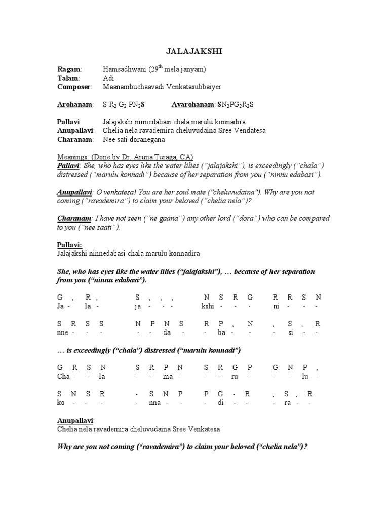 Web My colleague who is a Veena player forwarded me the lyrics and the notation for the Varnam Jalajakshi Ninnedabasi in Hamswadhwani.